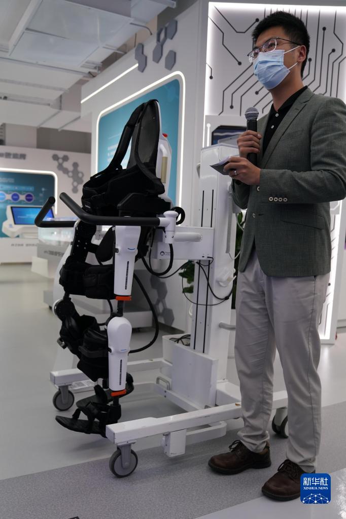 5月11日,在上海城市數字化轉型體驗館“解碼生命”區域,工作人員介紹一款下肢康復機器人。新華社記者 馬寧 攝