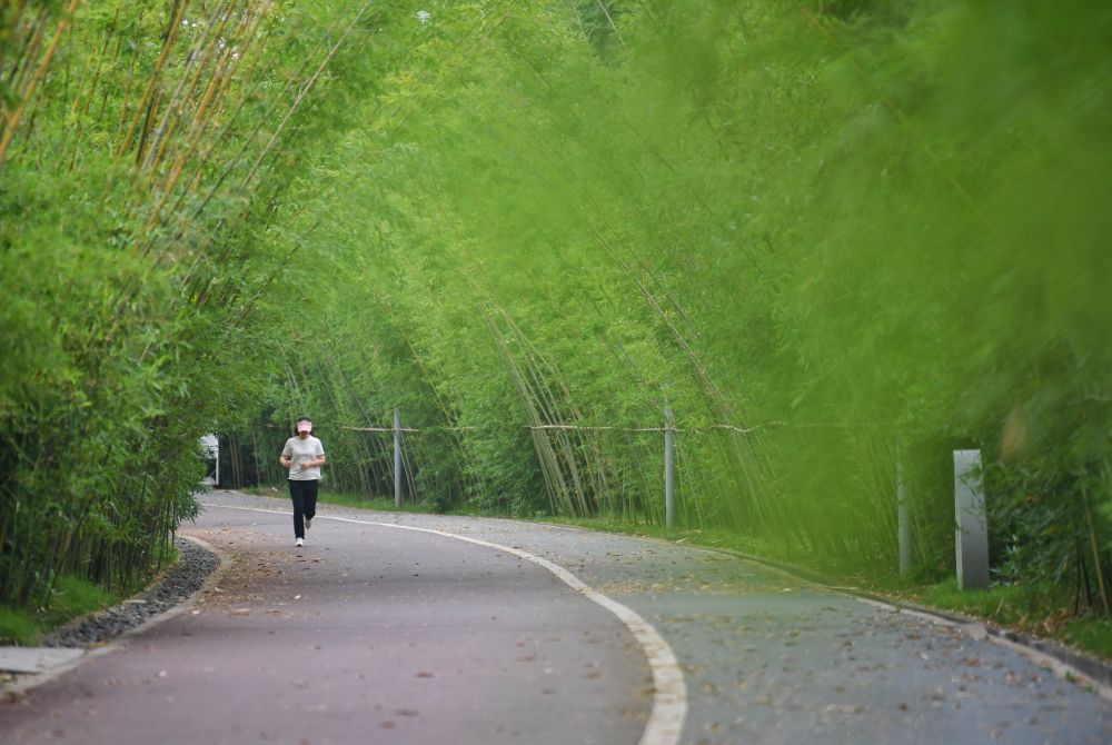 在四川省宜賓市江安縣長江竹島,市民在由河中村改造成的綠色生態公園里跑步(2023年5月31日攝)。新華社記者 劉坤 攝 水與人、水與城、人與自然和諧共生,生產空間、生活空間、生態空間互利共榮的畫卷正徐徐展開。