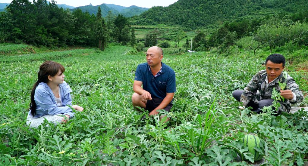 圖為貴陽市烏當區新堡鄉新堡村一農場負責人林正福查看西瓜生長情況。(韋登亮 攝)