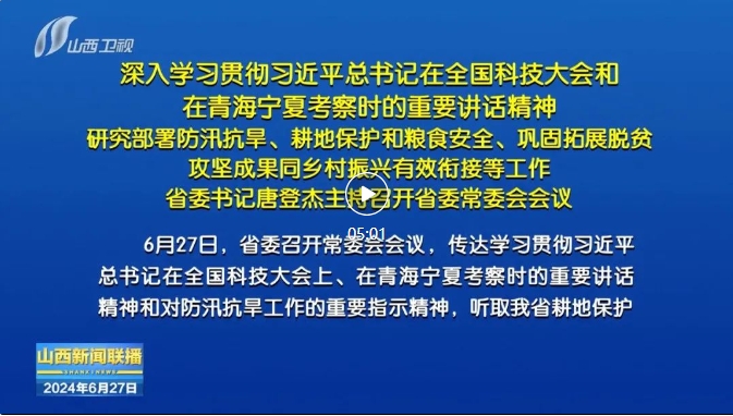 山西日報報道6月27日,省委召開常委會會議,傳達學習貫徹習近平總書記在全國科技大會上、在青海寧夏考察時的重要講話精神和對防汛抗旱工作的重要指示精神,聽取我省耕地保護和糧食安全責任制工作落實、2023年度市縣黨委和政府鞏固拓展脫貧攻堅成果同鄉村振興有效銜接考核情況匯報,審議通過《山西省2023年度國家鞏固拓展脫貧攻堅成果同鄉村振興有效銜接考核評估反饋問題整改工作方案》。省委書記唐登杰主持會議。
