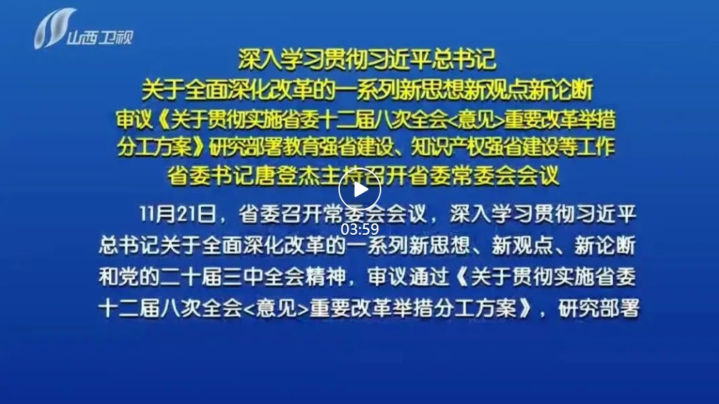 山西日報報道 11月21日,省委召開常委會會議,深入學習貫徹習近平總書記關于全面深化改革的一系列新思想、新觀點、新論斷和黨的二十屆三中全會精神,審議通過《關于貫徹實施省委十二屆八次全會〈意見〉重要改革舉措分工方案》,研究部署教育強省建設、知識產權強省建設等工作。省委書記唐登杰主持會議并講話。