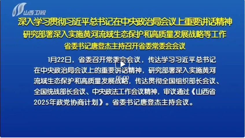 山西日報報道 1月22日,省委召開常委會會議,傳達學習習近平總書記在中央政治局會議上的重要講話精神,研究部署深入實施黃河流域生態保護和高質量發展戰略,傳達貫徹全國組織部長會議、全國統戰部長會議、中央政法工作會議精神,審議通過《山西省2025年政黨協商計劃》。省委書記唐登杰主持會議。