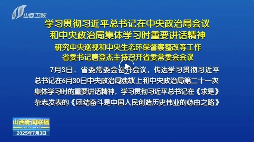 7月3日,省委常委會召開會議,傳達學習貫徹習近平總書記在6月30日中央政治局會議上和中央政治局第二十一次集體學習時的重要講話精神,學習貫徹習近平總書記在《求是》雜志發表的《團結奮斗是中國人民創造歷史偉業的必由之路》重要文章,傳達貫徹張國清同志在晉調研指示精神,聽取中央巡視邊巡邊改、中央生態環保督察邊督邊改工作情況匯報,研究部署下一步工作。省委書記唐登杰主持會議。