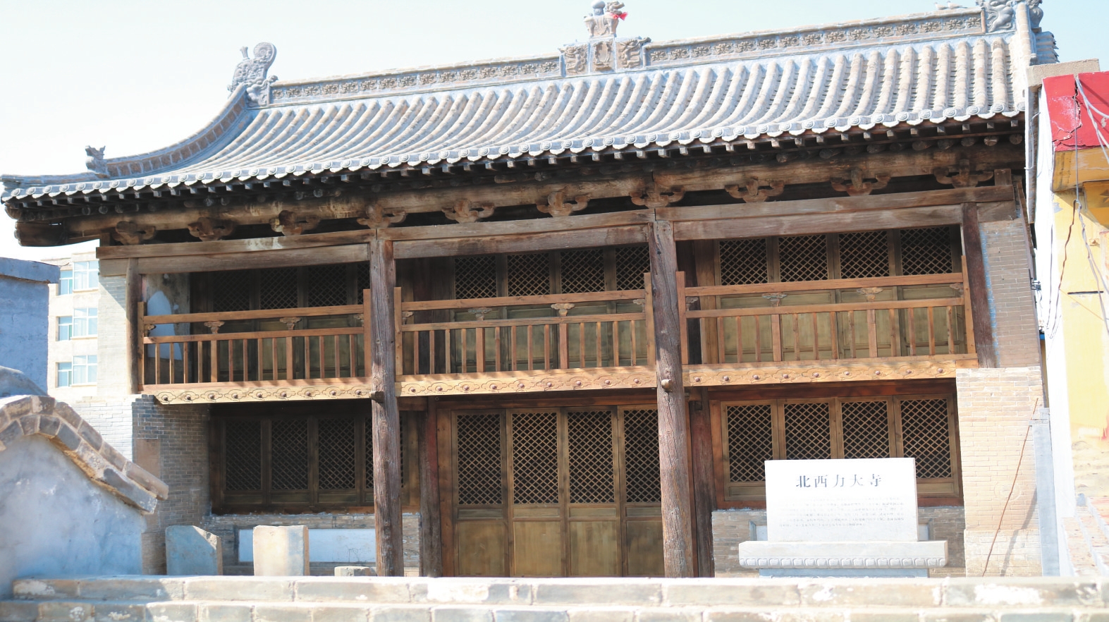 北西力大寺位于定襄縣晉昌鎮北西力村中,坐北朝南,東西長11.1米、南北寬8.4米,占地面積約93平方米。據梁架題記記載為明萬歷四十三年(1615)所建。該寺沿中軸線原建有山門、過廳、正殿,兩側建有東西配房。現僅存正殿,為二層樓閣式結構,面寬三間,進深四椽,前設廊,單檐懸山頂,五檁架結構。二層廊前兩側有人物壁畫約4平方米。2015年8月25日公布為市級文物保護單位。 (責任編輯:梁艷) |