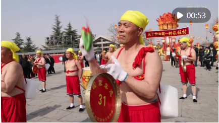 新春佳節,在山西省永濟市鸛雀樓景區,民間藝人們表演社火“背冰”,受到游客的熱烈歡迎。只見在凜冽的寒風中,二十多名黃河漢子冒著零度左右的氣溫,身著短褲赤膊上陣,背著從黃河里撈起的大冰塊,在鑼鼓伴奏下列隊前行,展示了黃河漢子彪悍勇敢、不畏艱難困苦的鐵骨精神,寄托了勞動人民祛邪、避災、祈福的美好愿景。