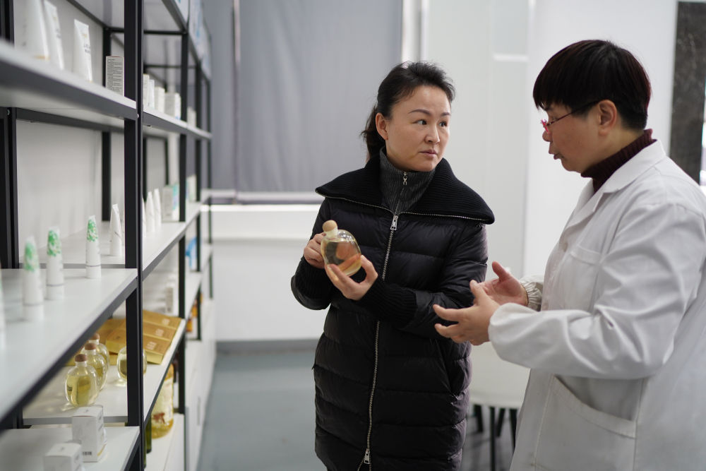 明經華(左)在位于江西贛州市章貢區的贛州哈克生物科技有限公司調研油茶深加工產業(2023年2月24日攝)。新華社記者 周密 攝