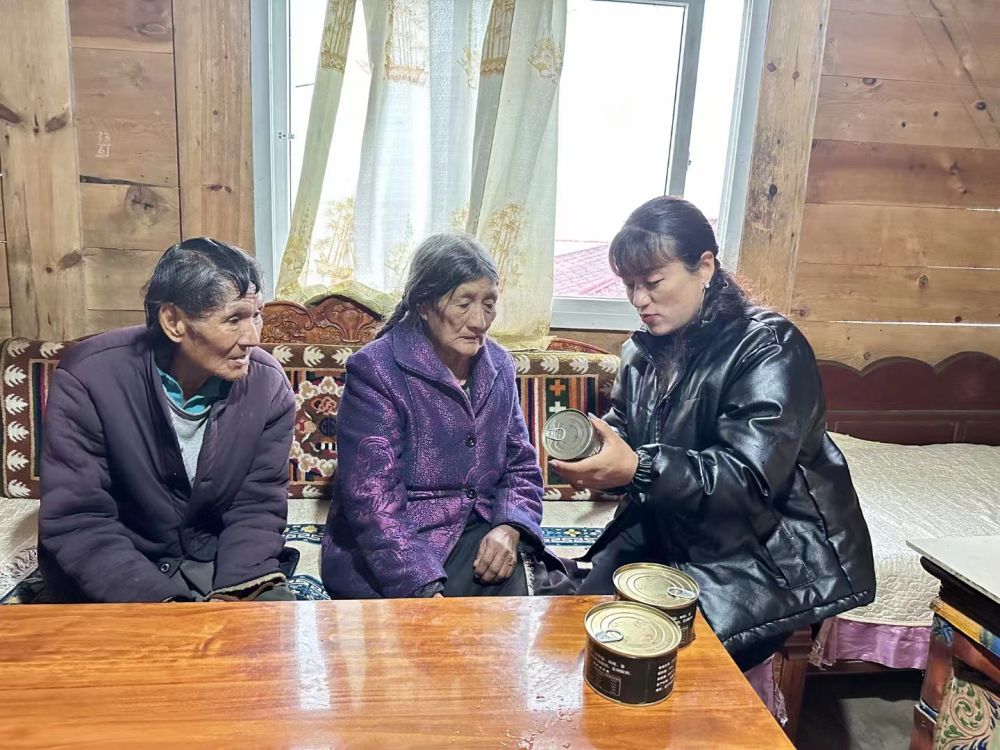 羅布央宗(右)在西藏墨脫縣墨脫村看望村民(2023年2月攝)。新華社發