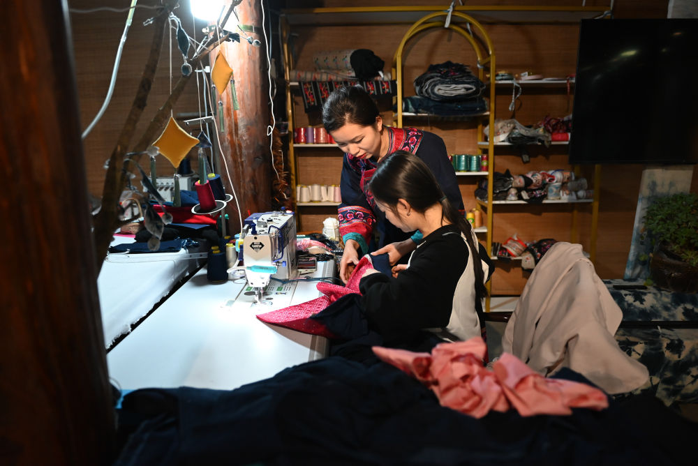 李利(后)在貴州省興義市萬峰林景區門店內與員工一起制作民族服飾(2024年2月19日攝)。新華社記者 劉續 攝