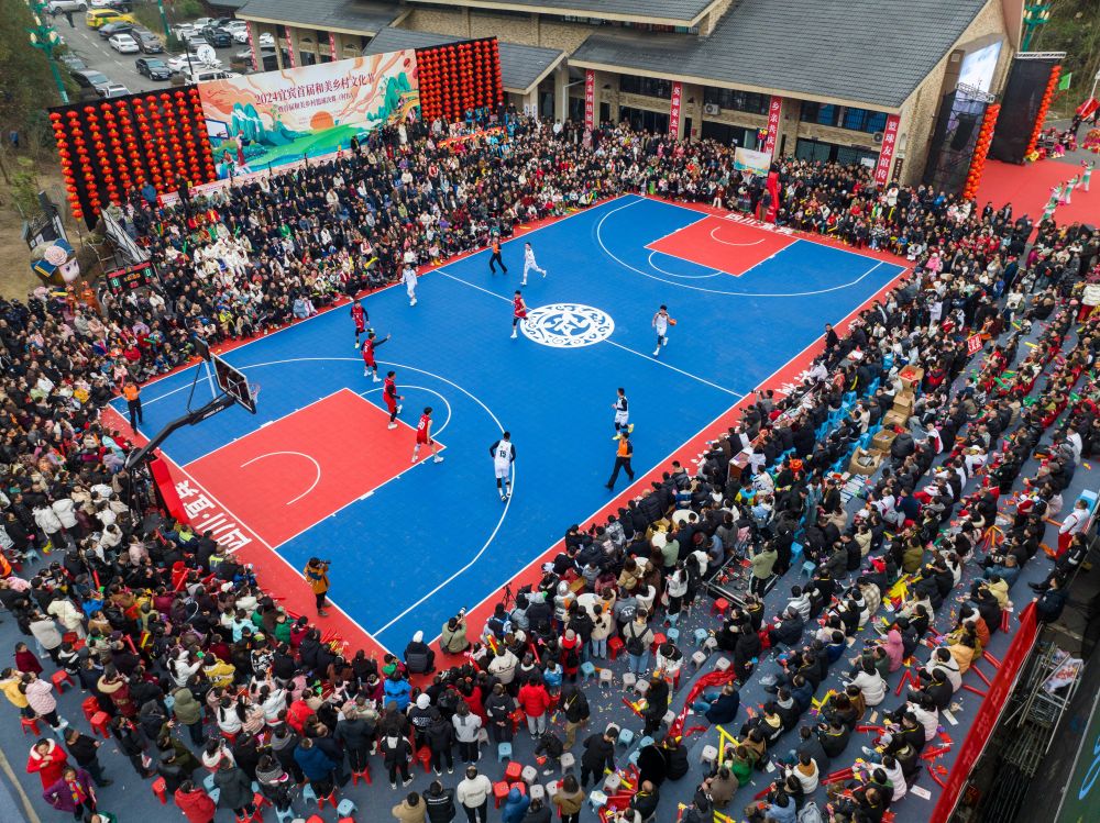 2024年1月29日,村民、游客在現場觀賽(無人機照片)。當日,在四川省宜賓市珙縣巡場鎮三合村,2024宜賓首屆和美鄉村文化節暨首屆和美鄉村籃球決賽(村BA)舉行,同時,現場還舉行了非遺年貨購物節、消費券發放等活動,以賽事經濟激發鄉村活力。新華社發(莊歌爾攝)
