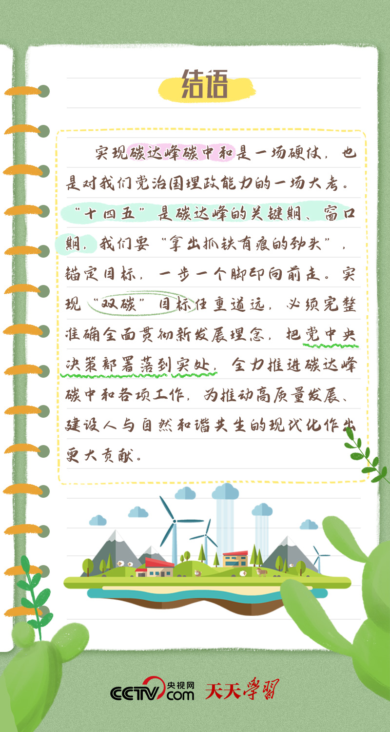 天天學(xué)習(xí)今年全國(guó)兩會(huì),習(xí)近平總書(shū)記在政協(xié)聯(lián)組會(huì)上,對(duì)“雙碳”工作作出最新部署。總書(shū)記強(qiáng)調(diào):“全面準(zhǔn)確落實(shí)精準(zhǔn)治污、科學(xué)治污、依法治污方針,推動(dòng)經(jīng)濟(jì)社會(huì)發(fā)展綠色化、低碳化,加強(qiáng)資源節(jié)約集約循環(huán)利用,拓展生態(tài)產(chǎn)品價(jià)值實(shí)現(xiàn)路徑,積極穩(wěn)妥推進(jìn)碳達(dá)峰碳中和,為高質(zhì)量發(fā)展注入新動(dòng)能、塑造新優(yōu)勢(shì)。” 實(shí)現(xiàn)碳達(dá)峰碳中和,是以習(xí)近平同志為核心的黨中央統(tǒng)籌國(guó)內(nèi)國(guó)際兩個(gè)大局作出的重大戰(zhàn)略決策,是著力解決資源環(huán)境約束突出問(wèn)題、實(shí)現(xiàn)中華民族永續(xù)發(fā)展的必然選擇,是對(duì)推動(dòng)構(gòu)建人類命運(yùn)共同體的莊嚴(yán)承諾。