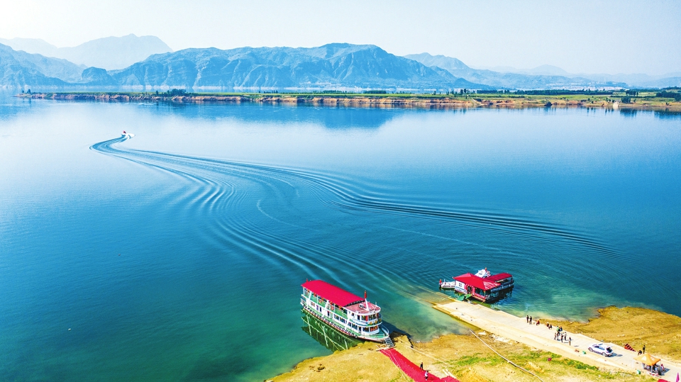 5月5日,在垣曲縣古城國家濕地公園內,游客或乘游輪、或乘快艇,游覽濕地如詩如畫美景,樂享假日。近年來,隨著當地加大濕地開發與保護力度,黃河濕地生態環境得以明顯改善,生態文明建設成果更好地惠及人民。