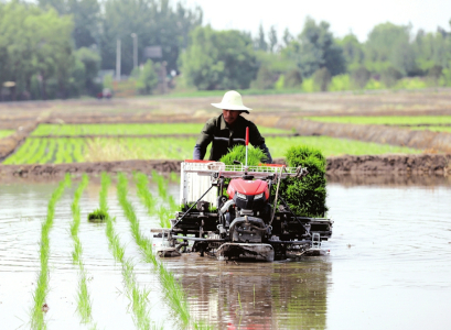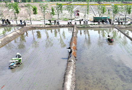 5月28日,太原市晉源區晉祠水稻插秧節在稻田公園舉行。活動現場,機器轟鳴、水波蕩漾,自動化插秧機勻速前進,水田里留下一簇簇新綠。卷褲腳、戴草帽、踏稻田、插秧苗、踩泥巴、捉魚蝦……一群群研學的孩子分批下田,感受手工插秧的樂趣,細嗅農耕勞作的氣息。田埂上圍觀群眾的加油聲、喝彩聲不絕于耳,現場一片熱火朝天。