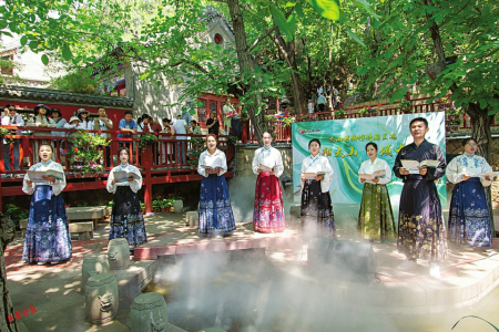 在太山景區售票廳里,背誦古詩詞免門票的活動吸引了不少18周歲以下的學生參加,大家通過轉盤選定需要背誦的古詩詞,完成背誦即可獲得門票一張。“和同學們正好一塊兒來了,通過參加這個活動,弘揚我們的傳統文化,是非常有意義的。”今年暑期,太山景區面向廣大學生推出皮影戲、手工DIY印章、拓印等非遺體驗活動。同時,景區還準備了2000多套漢服,免費為游客提供。