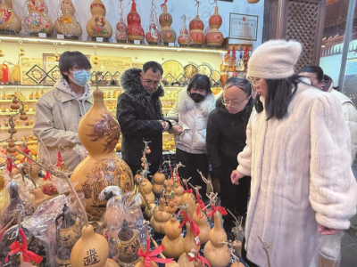在吆喝聲此起彼伏的年貨市集,醒獅帽、剪紙、提燈等頗具年味的商品擺滿攤位,讓游客目不暇接,尤其是精美的葫蘆烙畫、面塑、扎染等非遺,既有傳統文化的風韻,又融入現代設計巧思。