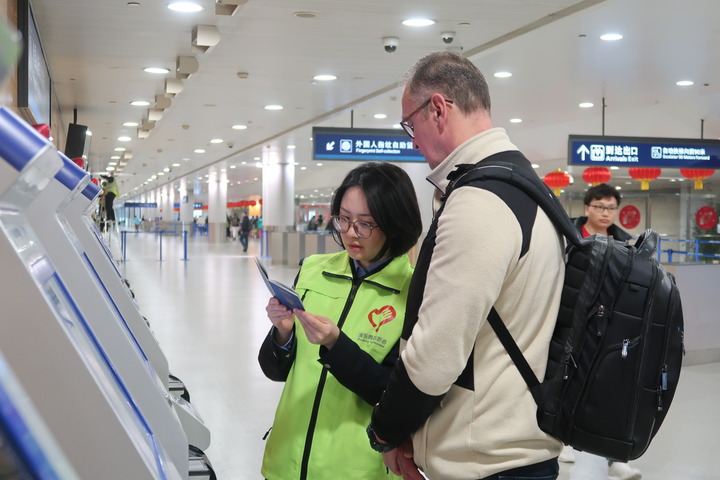 上海機場邊檢“百人外語志愿服務隊”民警正在協助外國旅客辦理入境手續。新華社記者唐斯琦 攝