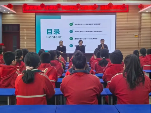 為進一步加強校園法治教育,增強學生的法治意識和自我保護能力,營造和諧安全的校園環境,2月20日,原平市檢察院第一檢察部檢察官任慧英走進原平市第八小學,以“知法守法 從我做起”為主題,給同學們帶來一堂生動有趣的法治教育課,通過案例講解、互動問答、宣誓簽名等形式,在孩子們心中播撒法治的種子。 課堂上,檢察官任慧英用通俗易懂的語言,向同學們講解法律的定義,并結合小學生生活場景,引導大家思考“班規與法律的區別”“如何用法律保護自己”。針對校園欺凌、網絡詐騙等熱點問題,通過真實案例傳授學生自我保護技巧。課后,在檢察干警的帶領下,全體學生高舉右拳,莊嚴宣誓,并在主題橫幅上鄭重簽名,許下爭當守法小公民的承諾。