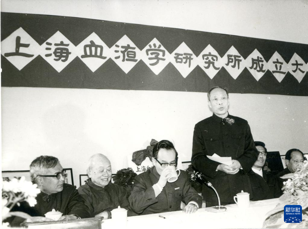 1987年3月23日,王振義(左四)參加上海血液學研究所揭牌儀式。新華社發(上海交通大學醫學院供圖)