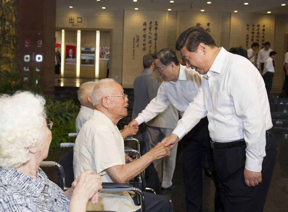 2014年7月7日,首都各界在中國人民抗日戰爭紀念館隆重集會,紀念全民族抗戰爆發77周年。習近平出席紀念儀式并發表重要講話。這是參觀結束后,習近平等親切看望參加儀式的抗戰老戰士和老同志代表。