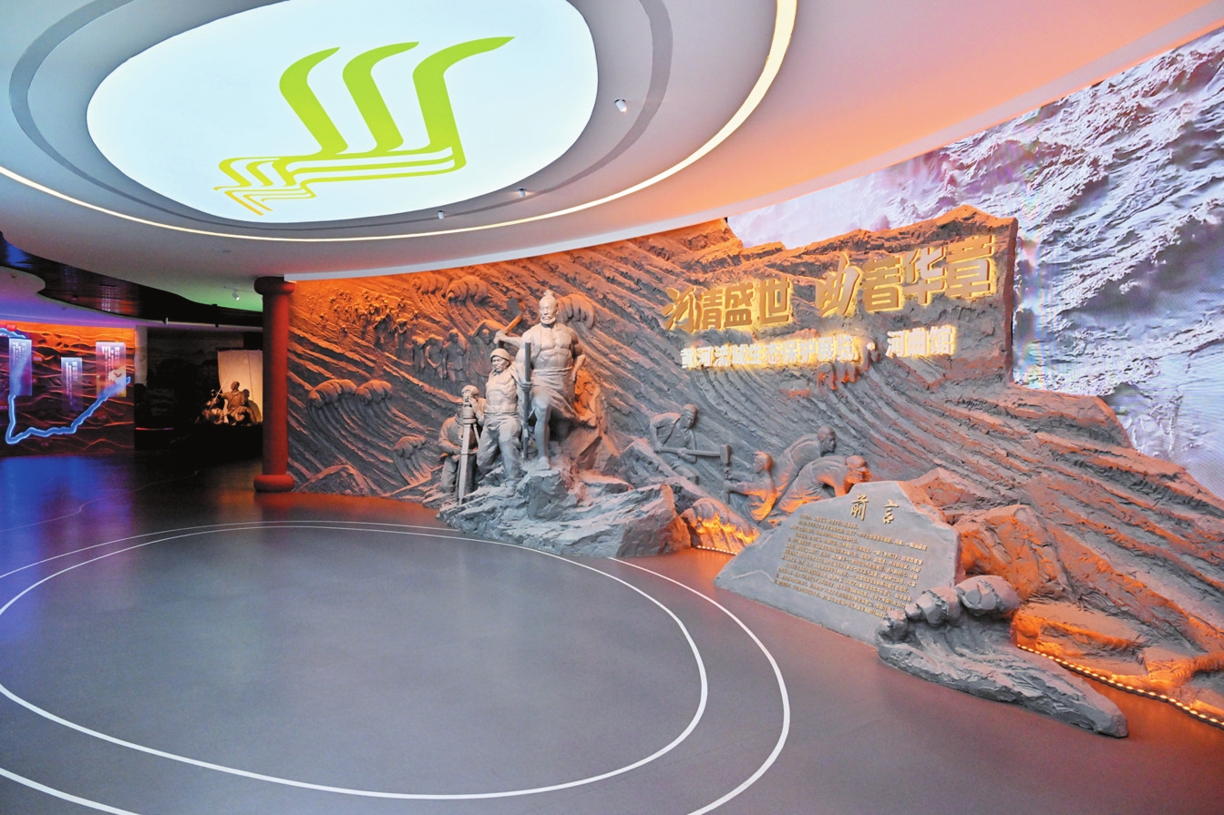 “新中國成立后,河曲人用70年改寫了這部苦難史?!彪S著講解員王昭怡的引導,第二篇章“大河之韻·生態保護”展區的光影漸亮?!翱?,這是賀六十九帶領村民造林護岸的場景復原?!表樦v解員的手勢,50年代勞模賀六十九的雕像在光影中栩栩如生,他手中的鐵鍬與背后萬畝林海的微縮模型定格成一個永恒畫面。“生前造林、死后看樹”的苗二滿紅銅像前,幻影成像技術正演繹他發明的“沙棗樹抗旱栽培法”,60年代“以糧為綱,治山治水”的標語墻記錄著那個年代的奮斗激情。最引人注目的是王海元帶領280名勞力“首戰掏泥溝”的群雕:刺骨寒風中,共產黨員們用帶血的雙手在流沙中筑壩,雕塑底座上印有“青山綠水一盆花,光棍寡婦安下了家”的民謠,道出了治沙人用苦累換來的幸福。