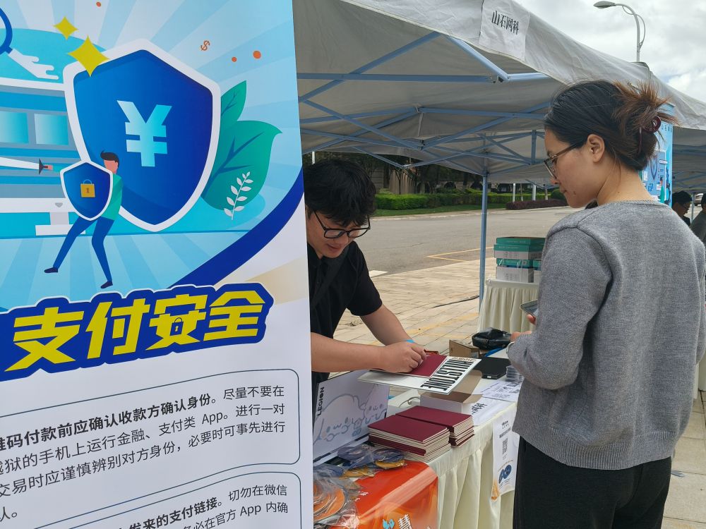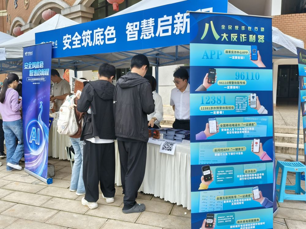 校園的露天廣場上還安排有網絡安全知識趣味問答活動,吸引學生參與,讓他們在輕松愉快的氛圍中鞏固了反詐知識。還有工作人員向路過的學生發放反詐宣傳手冊。